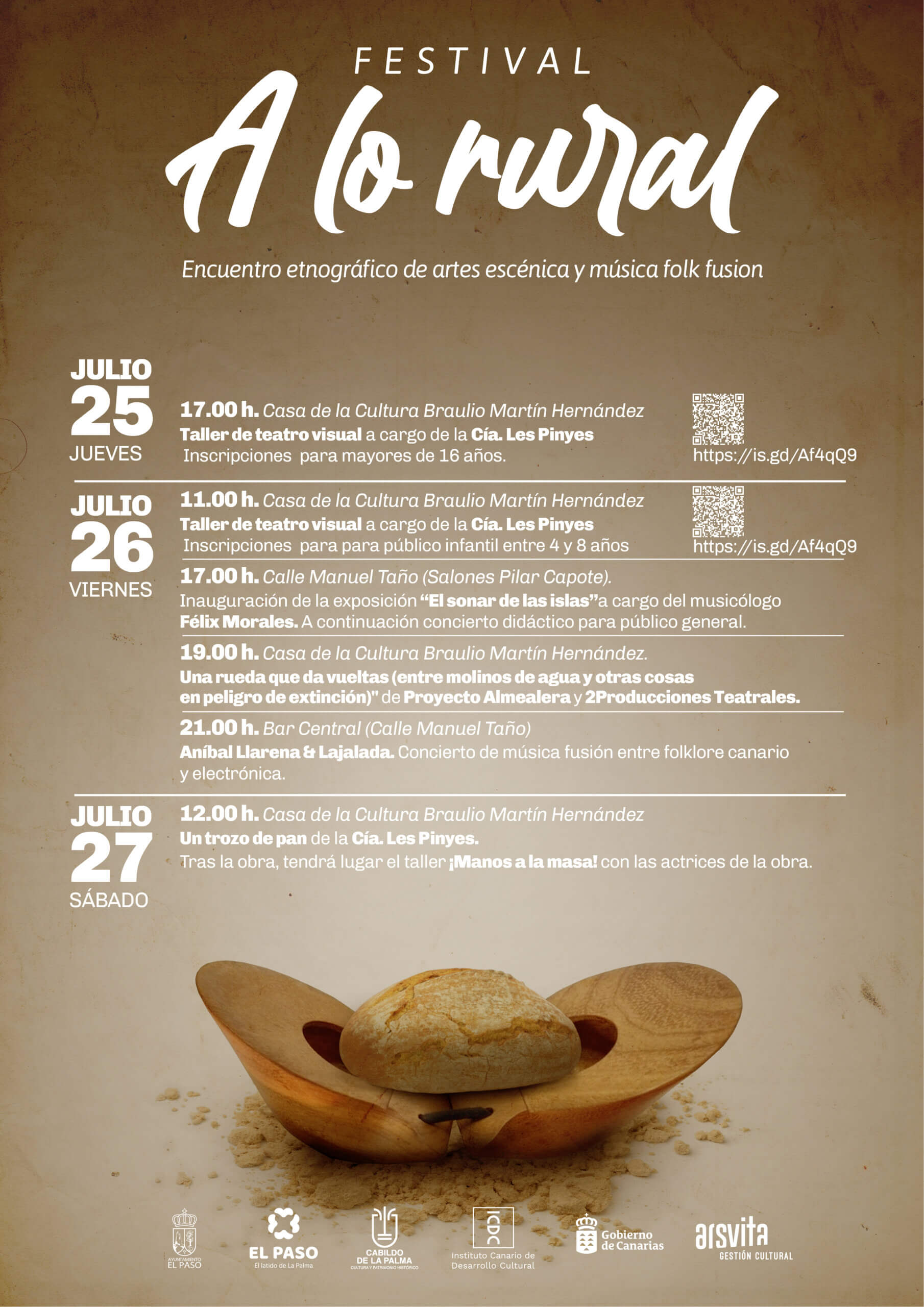 El sábado, 27 de julio, el festival cerrará con la obra de teatro familiar Un trozo de pan en la Casa de la Cultura Braulio Martín Hernández a las 12:00 horas, seguida del taller ¡Manos a la masa! con las actrices de Les Pinyes.