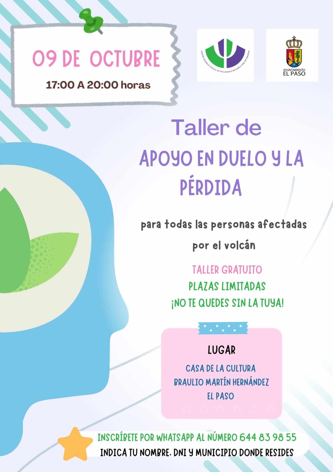 Casa de La Cultura Avenida Islas Canarias, 9, El Paso, Spain, El Paso, S/C de Tenerife, EspañaEl Paso acoge estos talleres dirigidos a la población afectada por el volcán, organizados por el Cabildo de La Palma e impartidos por el Colegio Oficial de Psicología de Santa Cruz de Tenerife. Miércoles 9: Apoyo en el duelo y la pérdida Miércoles 16: Manejo del estrés y la ansiedad Miércoles 23: Resiliencia y fortalecimiento […]