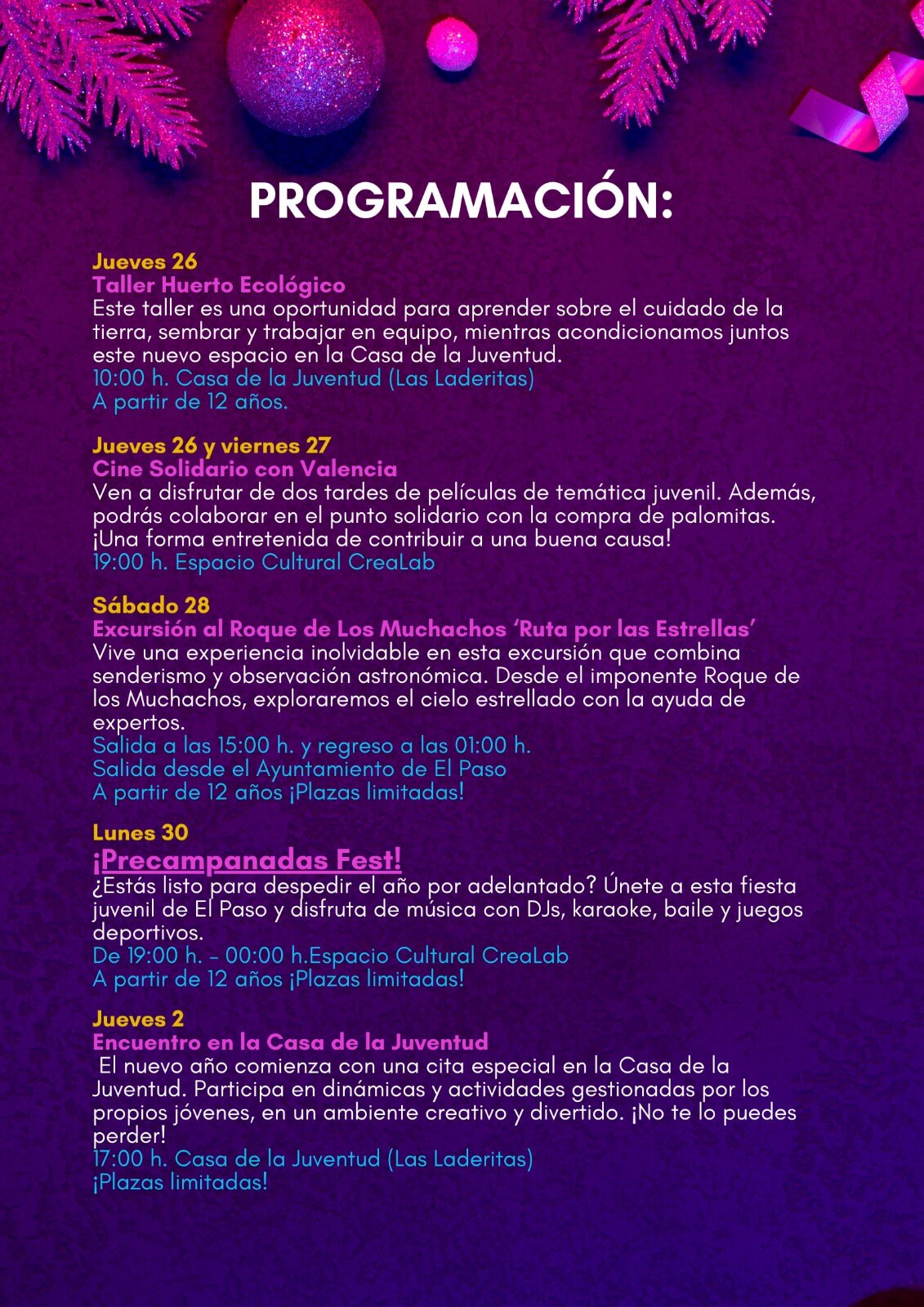 | Lunes 30 | ¡Precampanadas Fest! | Una fiesta juvenil de El Paso para despedir el año con música, DJs, karaoke, baile y juegos deportivos. | 19:00 h – 00:00 h | A partir de 12 años |